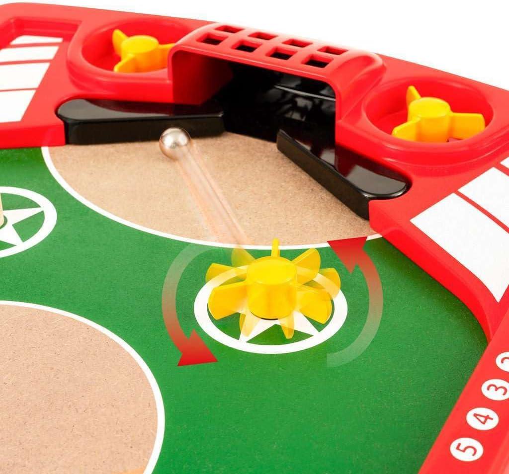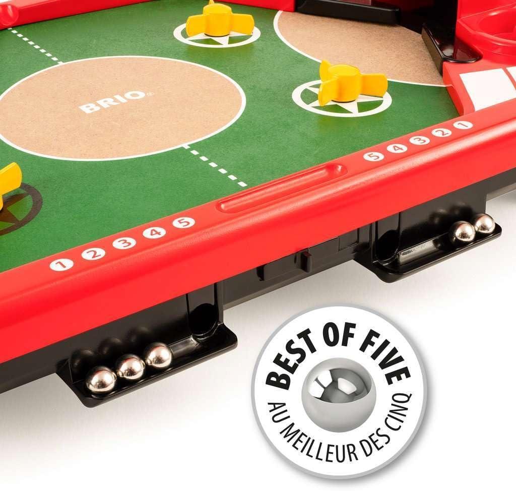 How to play : Pull back the lever and fire away trying to hit the metal marble into your opponent’s goal! Up the challenge by adding spinners to the board, changing the direction of the metal marble in unexpected ways – best of five wins.