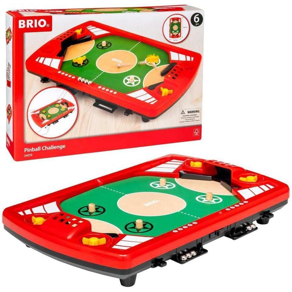 Product includes: The Pinball Challenge TableTop Game is crafted from a wooden base and plastic top. Includes metal marbles and spinners.