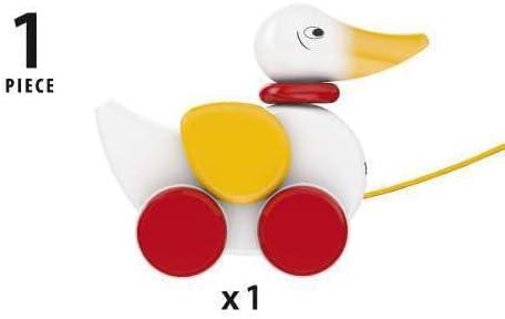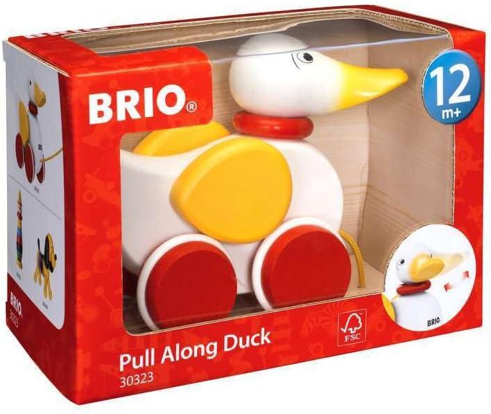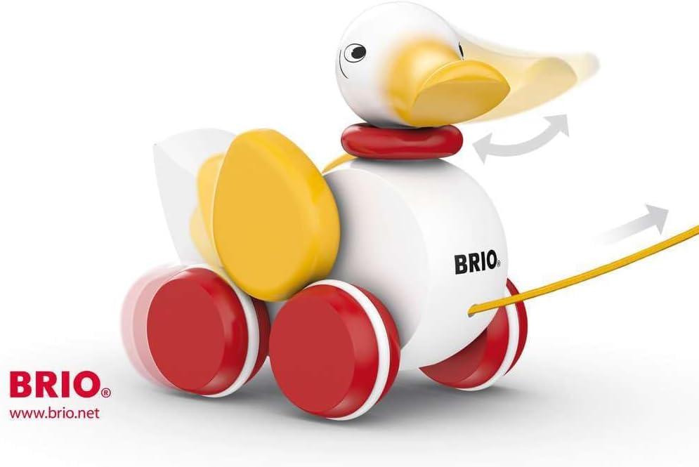 Founded in Sweden in 1884, Brio makes the highest quality wooden toys that have delighted children and created happy memories for generations. Both educational and fun, Brio's uncompromising focus on design, quality and craftsmanship create toys of lasting value that stimulate creativity and imagination. Engaging play and learning are integral themes in all Brio toys, satisfying a child's educational needs and growing with them through their various phases of development. Wooden pull toys are perfect for the active and newly mobile youngster. The Brio Pull Duck is classic play for today's toddler. There's no need to add water, just pull him along behind you with the yellow pull cord. He nods his head and flaps his wings to let you know he's still there. The bright red wheels work on any floor surface. Handcrafted to the exacting quality standards you'd expect from Brio, this durable, wooden playroom heirloom will be enjoyed for generations. Made of solid Beech wood and sanded silky smooth, they have 6 coats of non-toxic paint for a long lasting, chip resistant, vibrant glossy finish. The perfect size for the active, imaginative toddler, they'll learn to control movement, develop motor skills and develop balance with every step.