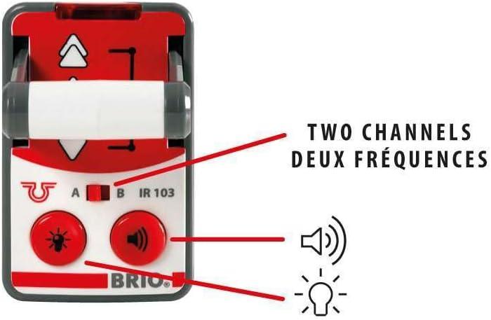 Experience the joy of interactive play with the Brio Remote Control Travel Train. This toy train set features a wagon and driver, complete with movable arms and legs, and is controlled by an easy-to-use, kid-friendly remote. With the ability to move forward at two speeds, reverse, and produce light and sound effects, this train set is sure to captivate your child's imagination. It's compatible with all Brio wooden railway sets, offering countless possibilities for creative play. The train set is designed for children aged 3 and above, making it a perfect gift for birthdays or Christmas. It requires 4 AA batteries (not included). All wooden parts of this toy are made from 100% FSC-certified beech wood from sustainably managed forests, ensuring a toy that's not only fun, but also built to last. With Brio, you're bringing home a toy that will create happy childhood memories, encourage creativity, and support your child's development.