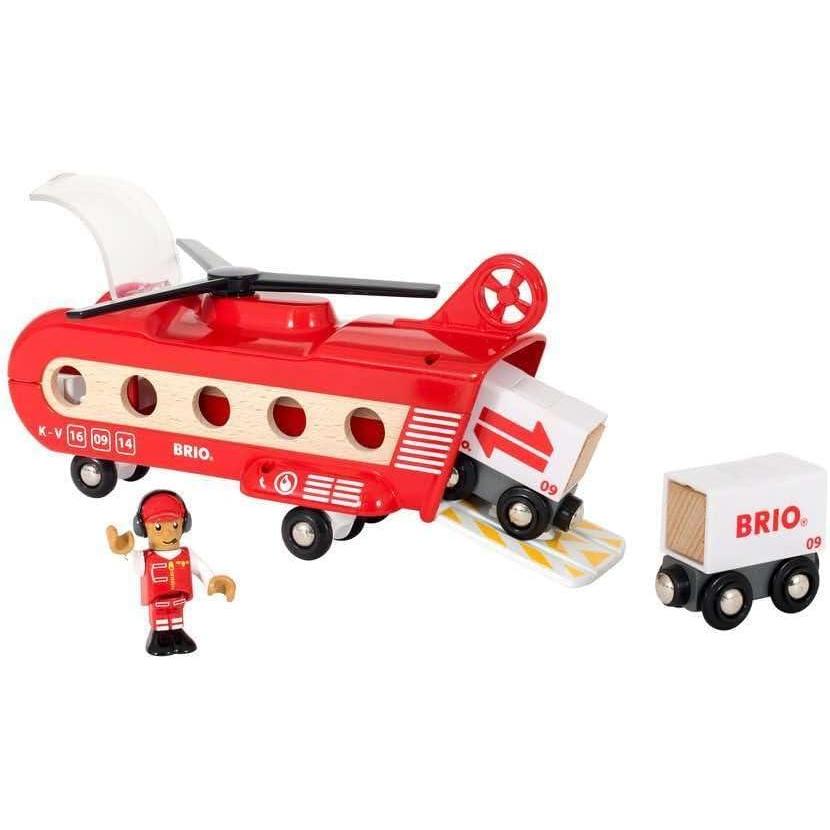 Take to the skies with the BRIO World 33886 Cargo Helicopter! This premium wooden train toy is made from durable European Beech Wood and is designed to last. We put safety first, conducting over 1,000 safety tests a year to ensure our toys meet all safety standards. The set includes a cargo helicopter, a figure, two wagons, two wooden loads, and two containers for a truly immersive play experience. The helicopter is compatible with all BRIO wooden railway sets, allowing your child's BRIO World to grow and evolve. Notable features such as the helicopter's cargo bay that opens to drive in the train wagons, free-spinning helicopter blades, a play figure with bendable arms and legs, and a cockpit that opens for the pilot, make this toy a favorite among kids. Suitable for ages 3 years and above, this toy promises hours of fun and creative play.