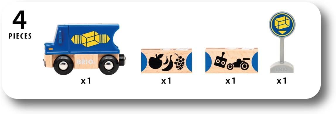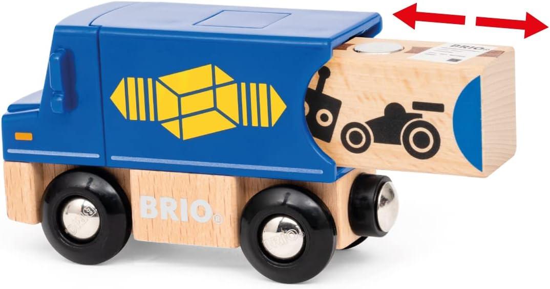 Beep beep! There’s a package for you on board the 36020 Delivery Truck. Stop at the marked delivery spot and unload the wooden goods from the back of the blue toy truck. Then drive to the next delivery, load it up and lock it into position with the help of magnets. It’s a busy day for the BRIO World delivery services so let’s get moving.