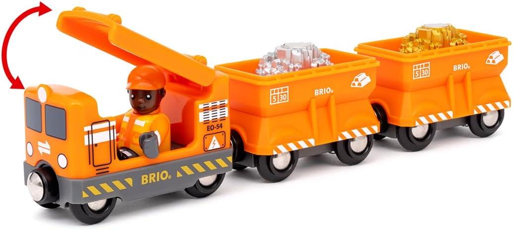 Haul the most precious loads with the 36049 Cargo Train. This vibrant orange toy train comes with two cargo wagons that are filled to the brim with gold and silver loads. Pop the engine roof open and drop the cargo-themed character into the driver’s seat before chugging off down the tracks. Equipped with classic BRIO magnetic connections, this toy train and accessories integrate seamlessly into BRIO World lift and load train sets and other cargo-themed toys.