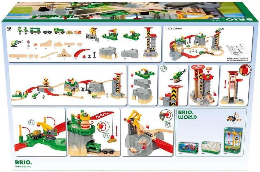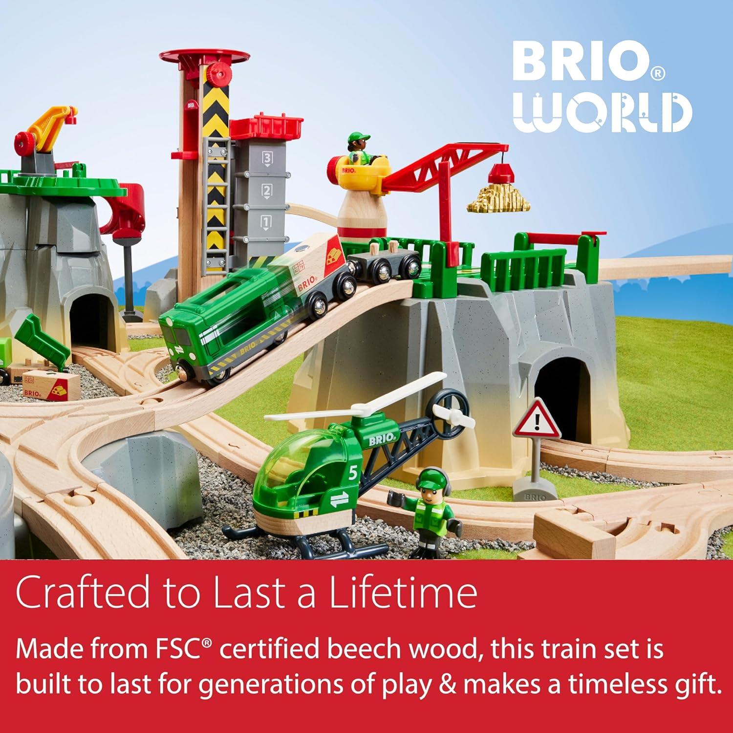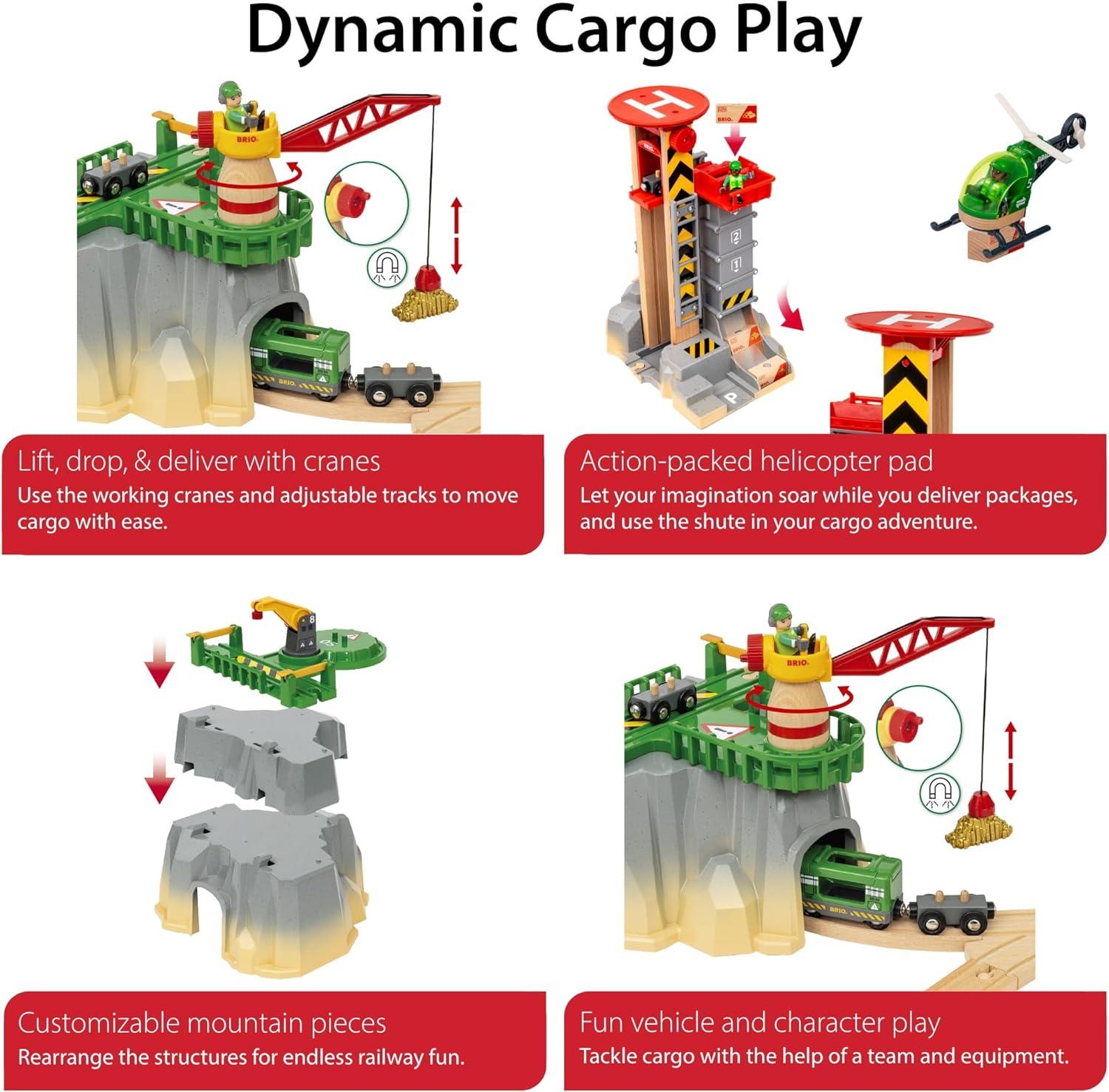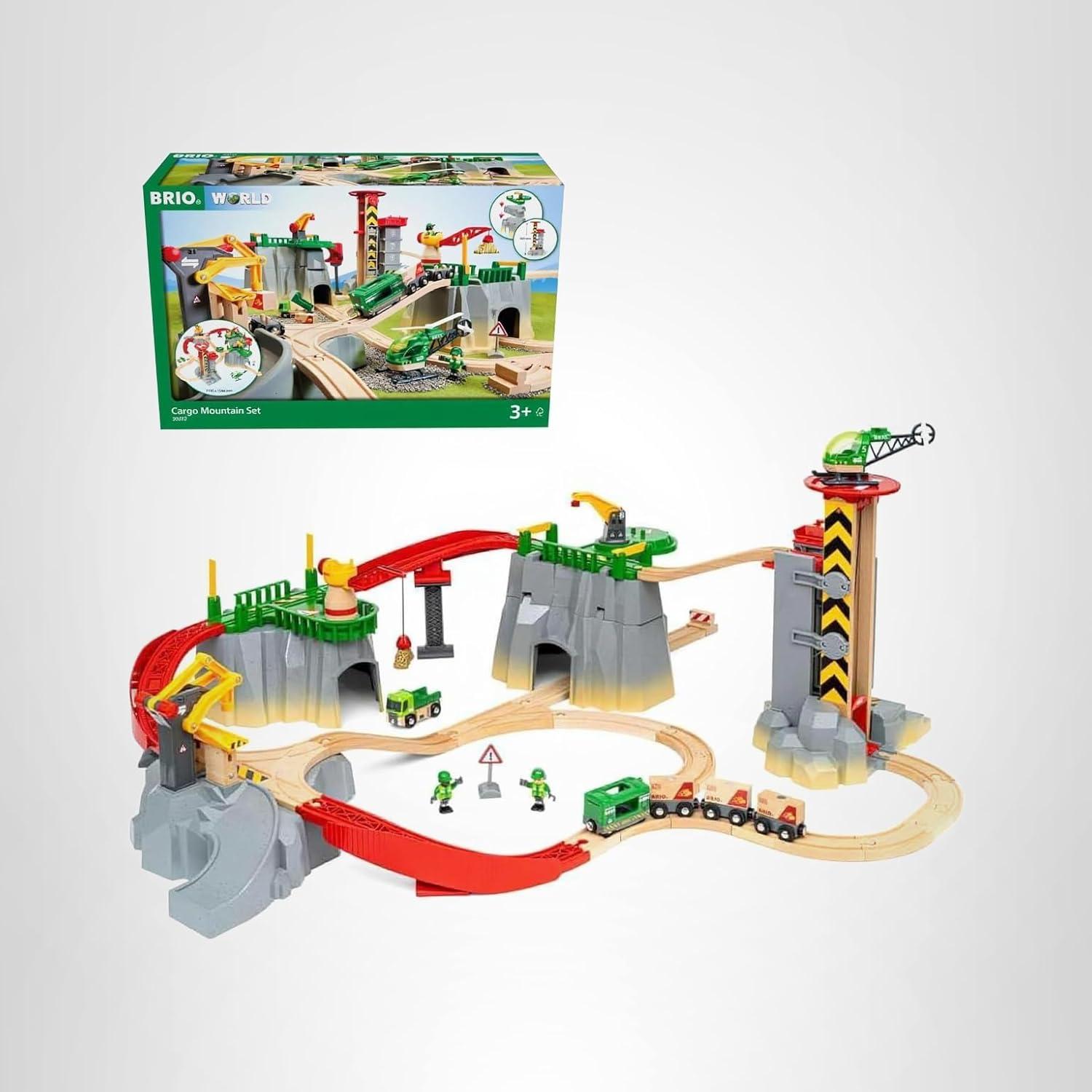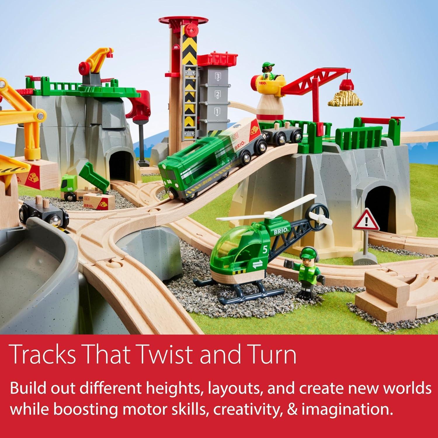 Introducing the Cargo Mountain Set from BRIO World. Compatible with all BRIO wooden train track sets, this timeless masterpiece celebrates over six decades of imaginative indoor play. Crafted with care from Forest Stewardship Council-certified wood and other sustainable resources, this exciting, dynamic, and multi-level 49-piece wooden train set promises durability and high quality while standing as a testament to responsible forestry practices.