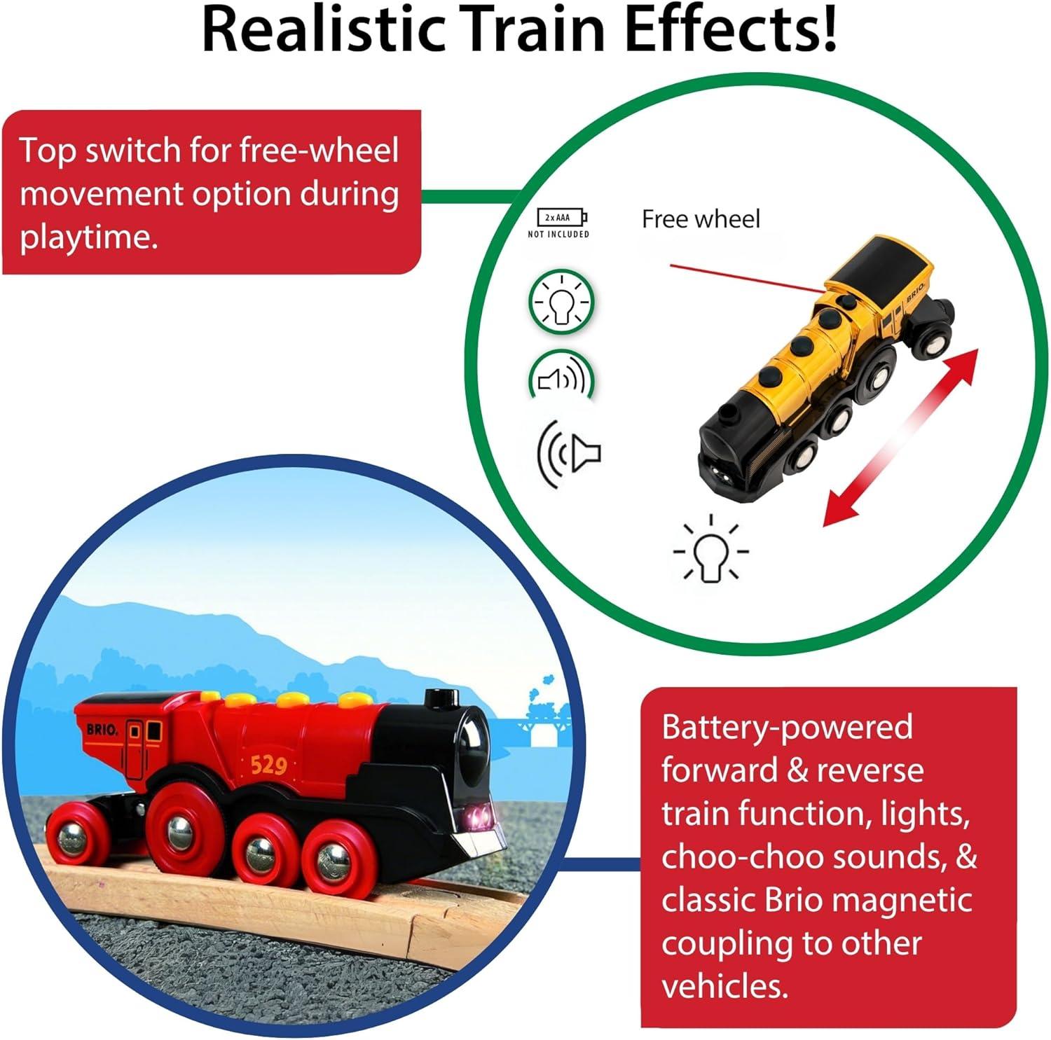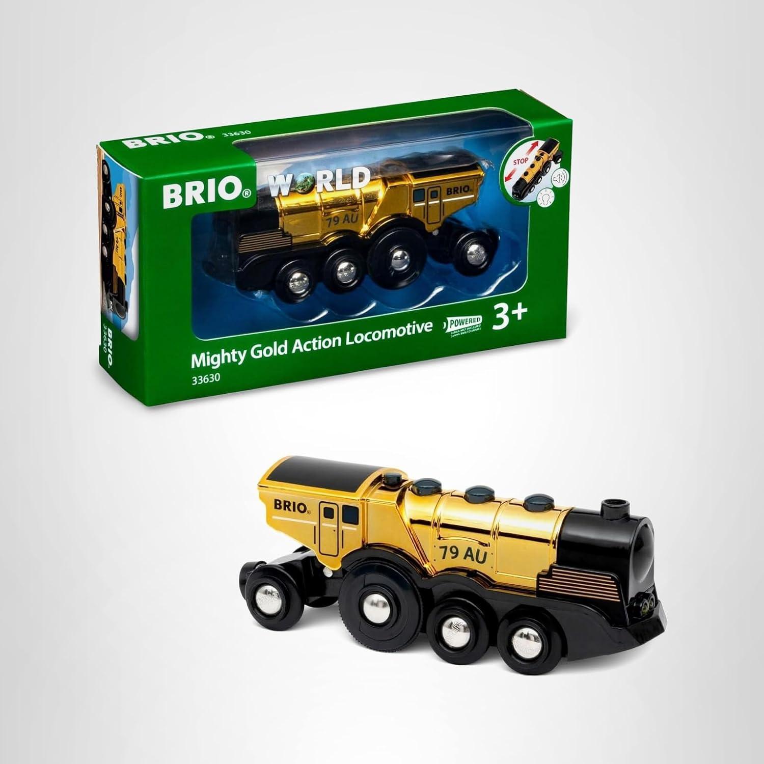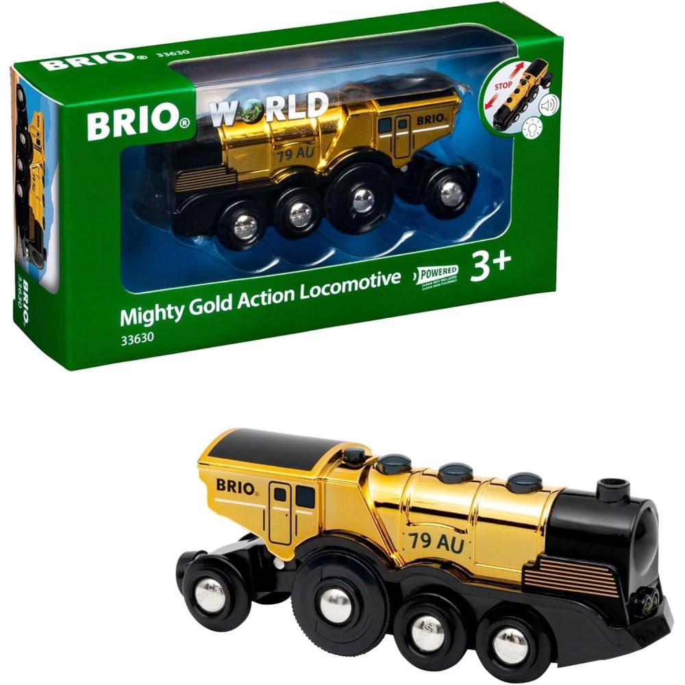Introducing the Mighty Golden Action Locomotive from BRIO World, a timeless masterpiece celebrating over six decades of imaginative indoor play. Crafted with care from Forest Stewardship Council-certified wood, this charming wooden train track accessory promises durability and high quality while standing as a testament to responsible forestry and sustainability practices. Your child will delight in growing their wooden railway empire with the interactive Mighty Golden Action Locomotive that will seamlessly fit into their existing sets. Unlimited railway empires await your boys and girls ages 3-4, 5-6, and older.