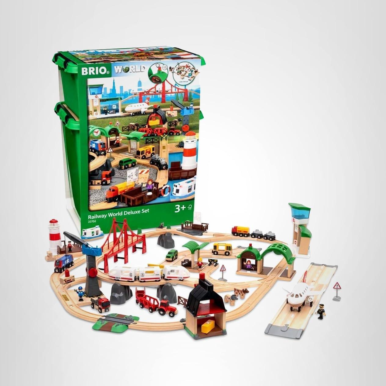 Introducing the Railway World Deluxe Set from BRIO World. Compatible with all BRIO wooden train track sets, this timeless masterpiece celebrates over six decades of imaginative indoor play. Crafted with care from Forest Stewardship Council-certified wood and other sustainable resources, this extensive 106-piece wooden train set promises durability and high quality while standing as a testament to responsible forestry practices. Consisting of trains, wood train tracks, figurines, airport, farm, and more.
